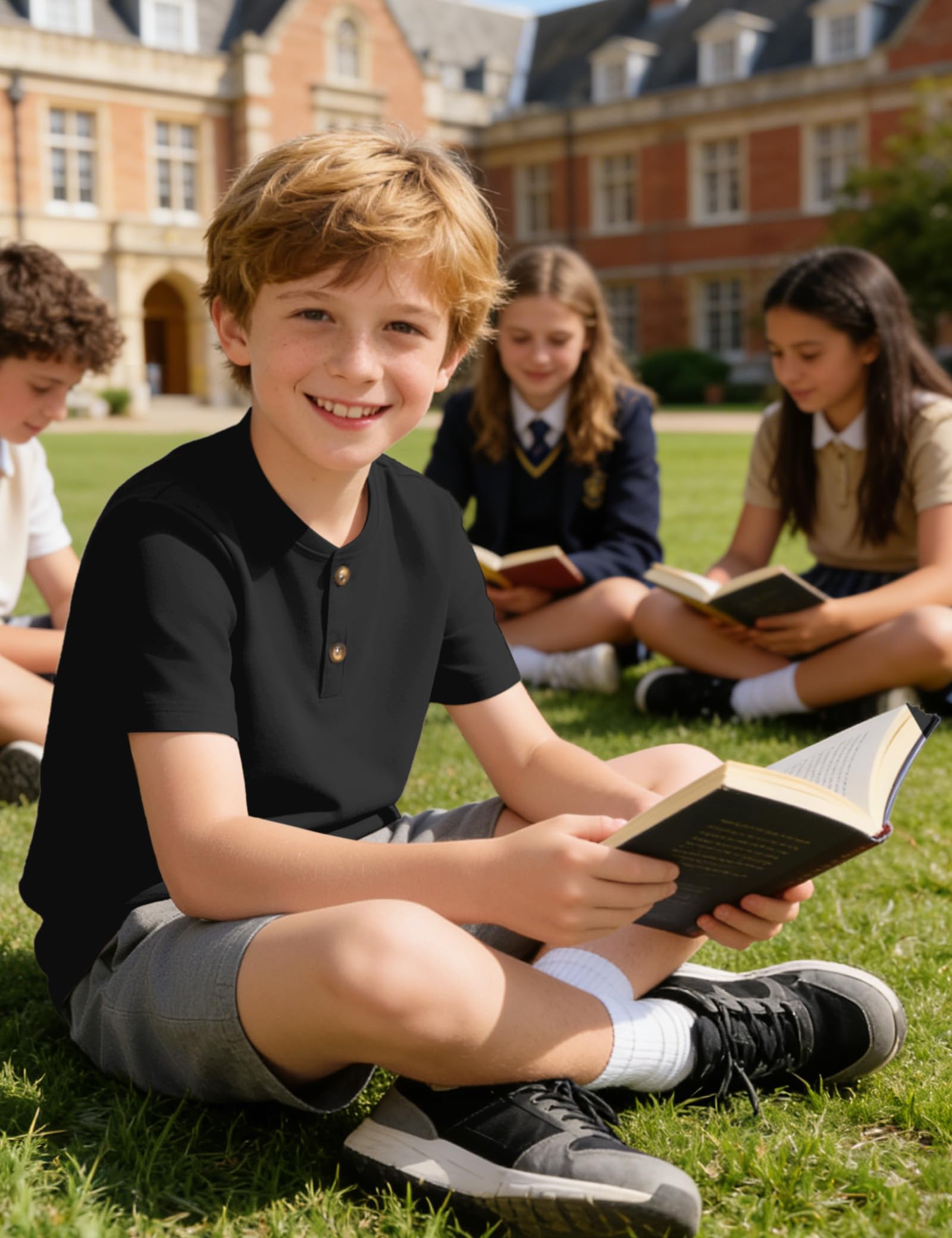 This boys short sleeve Henley shirt is made from soft, breathable cotton for comfortable everyday wear. Designed with a classic Henley neckline and a button front placket, it offers a clean, versatile look that works for casual outfits and slightly dressed-up occasions. Easy to wear on its own or layered under a jacket, it pairs well with jeans, joggers, or shorts for school, travel, and daily activities.