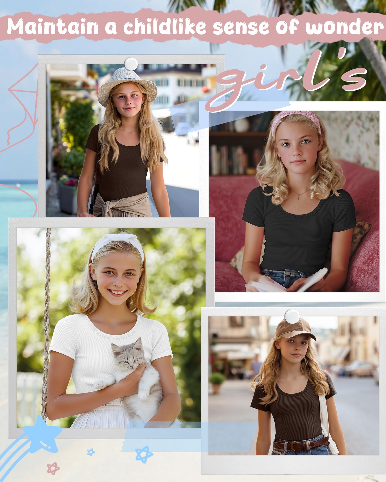 Features: Washing: Hand or machine wash in gentle with cold water, wash dark colors separately. Please check the size chart before purchasing to help you find a more accurate size. Nice present for girls: These fashion solid tops for kids make a sweet gift for your daughter or any little girl you love, and are ideal for birthdays, spring, summer, Easter, Back to School, and other special days. Specifications: Material: 95% Rayon, 5% Spandex Package includes: 3 x Girls Short Sleeve Ribbed Knit Shirts Notes: Manual measurement, please allow slight errors on size. The color may exist a slight difference due to different screen display. Check the size chart before purchasing, it would help you find a more accurate size for yourself. Hand/machine wash in gentle with cold water, put them in laundry bag if you use the machine washing, in case the drawstring to be snagged, hang to dry or line dry, do not bleach, warm iron if needed, wash dark colors separately