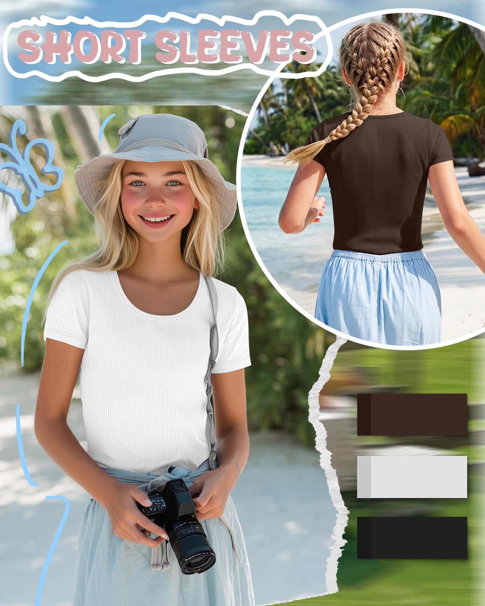 LessonZoo 3 Pack Girls Short Sleeve Shirts Ribbed Knit Scoop Neck T-Shirts Kids Solid Tops Slim Fit Casual Tees 5-14 Years